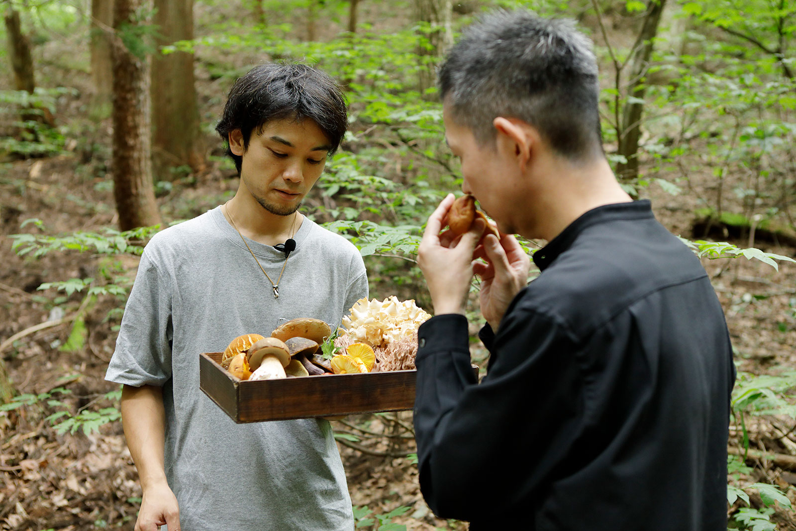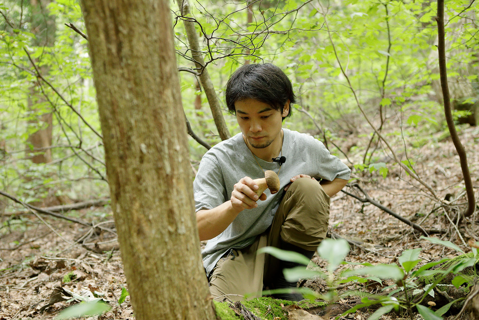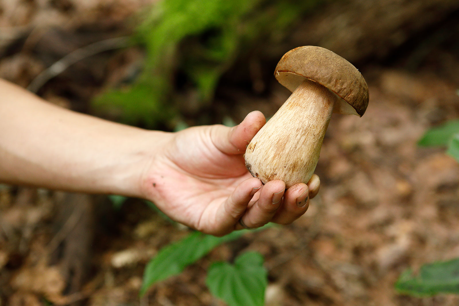 食べごろのおいしいキノコを求めて、木立の奥へと分け入る水上さんには迷いがありません。それもそのはず、水上さんは良いキノコの採取ポイントを、自らの足で10年以上かけて地道に開拓してきました。「僕だから出会えるキノコ、採れるキノコがある」と胸を張ります。「キノコはミズナラやアカマツ、コナラなど、菌根を作る樹種に共生します。日当たり、水はけ、風通しの3つが揃うことが、良いキノコが生える条件。ただし、生えてから1週間も経てば、溶けて土に還ってしまう。タイミングが合って、初めて採取することができるんです」。この日、採れたポルチーニも肉厚で見事な大きさ!独特の芳醇な香りを放ちます。